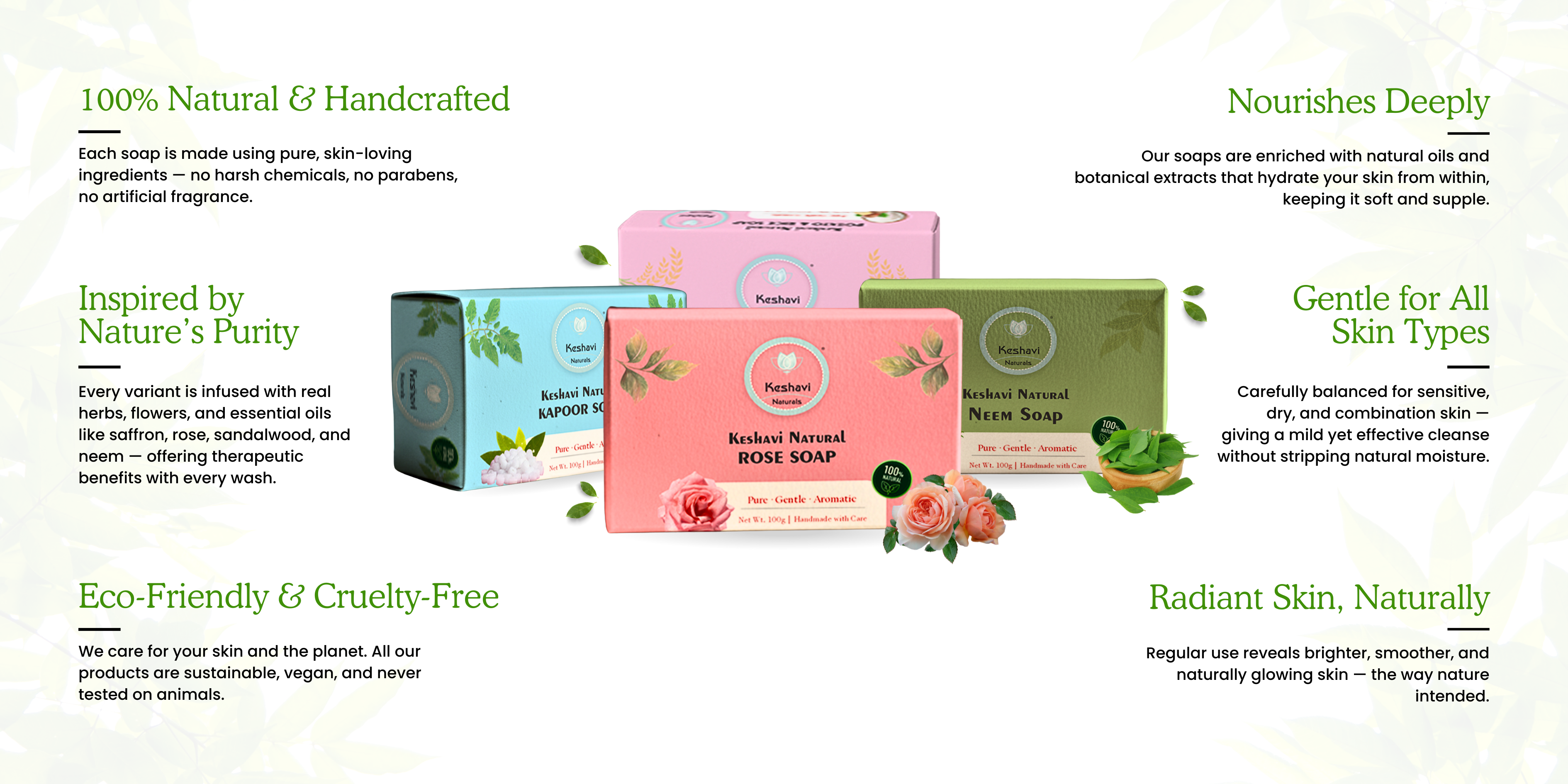 All Keshavi products are made with 100% natural ingredients — free from parabens, sulfates, and harsh chemicals. We use nature’s finest herbs, oils, and botanical extracts for healthy, glowing skin.